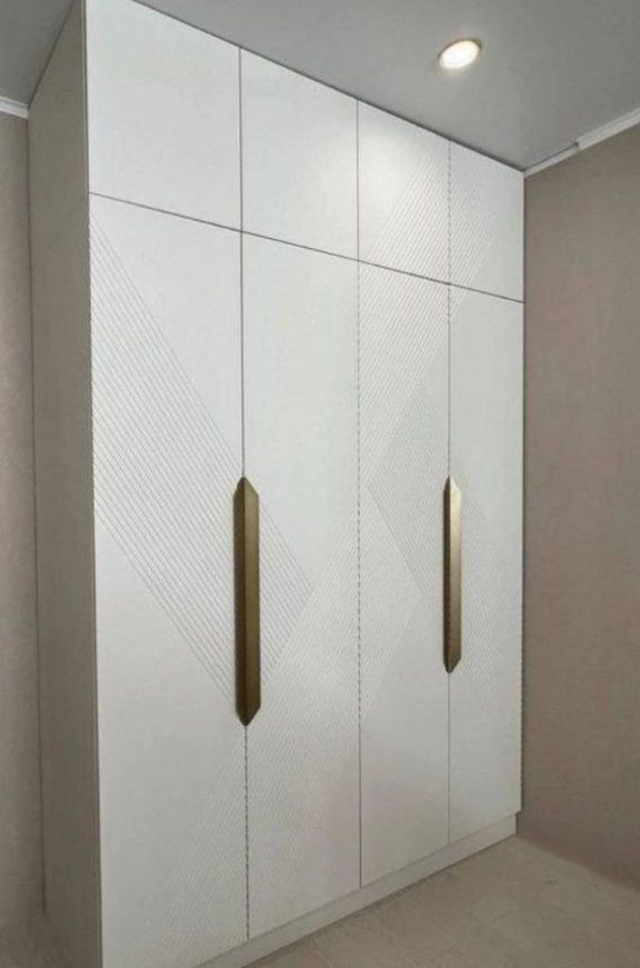 Шкаф МДФ с фрезой и золотыми ручками - это современная мебель с декоративным резным фасадом, выполненным из древесноволокнистой плиты средней плотности, и элегантной фурнитурой.