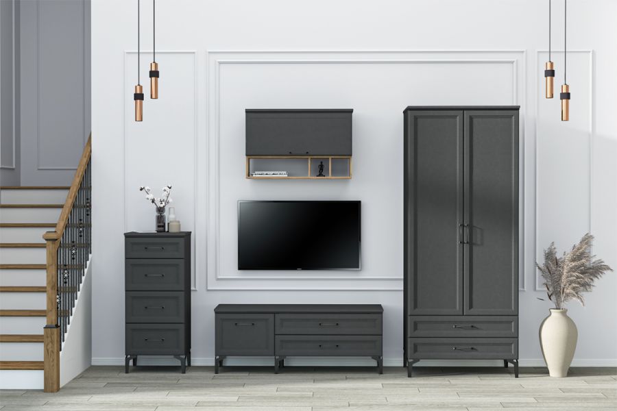 Материал/цвет: короб - ЛДСП (Антрацит), полка открытая - ЛДСП (Дуб Крафт золотой), фасад - МДФ рамка (Антрацит), ручки, опоры - металл (Чёрный).