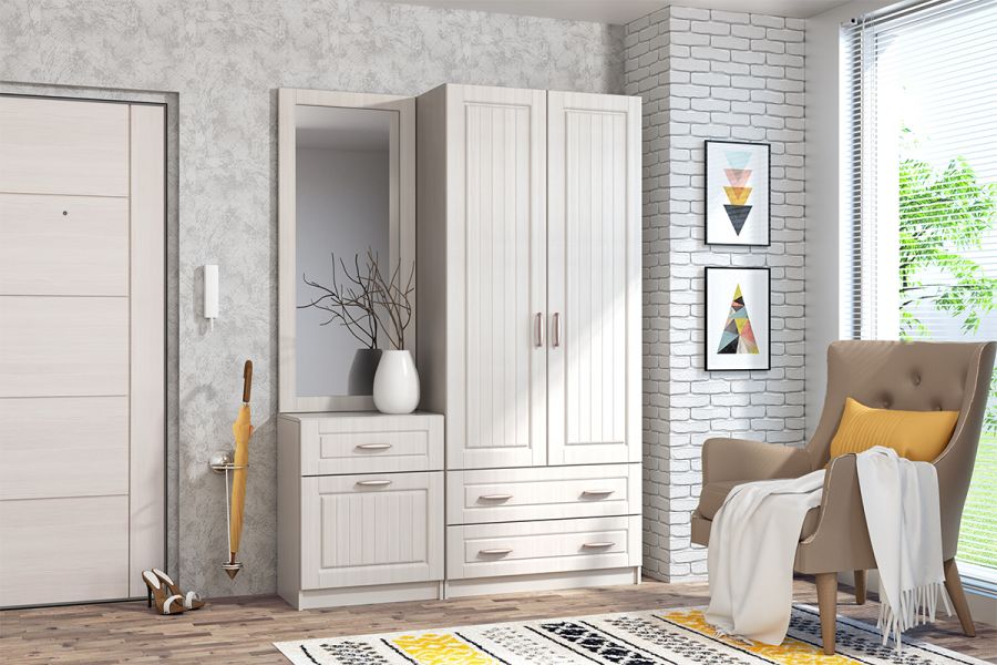 Зеркало (600х1350 мм); Распашной двухстворчатый шкаф (антресольная полка, ниша с выкатной штангой для одежды и тремя вместительными полками; два выдвижных ящика), 900х2100х390 мм.