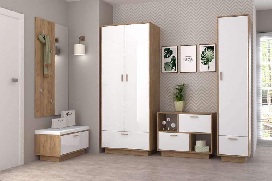 Материал/цвет: короб - ЛДСП (Дуб Крафт золотой), фасад - ЛДСП (Белый глянец); сиденье обувницы - экокожа (Белый глянец); ручки - пластик (Дуб Ватан); подиум - ЛДСП (Дуб Крафт золотой).
