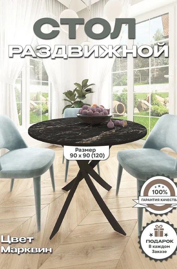 Стол Веста 90*90(120) декоре мрамор марквина на черном подстолье
