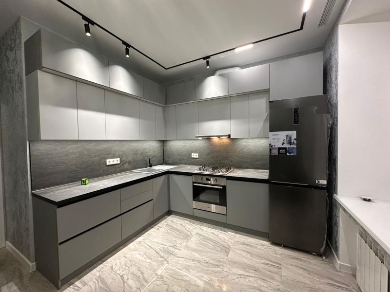 Современная кухня угловой планировки цвета графит, со встроенной техникой и подцветкой рабочих зон, без ручек. Современный стиль подчеркивается минималистичными фасадами без лишних деталей, гладкими поверхностями и отсутствием вычурного декора. Встроенная техника, интегрированная в кухонные шкафы, создает впечатление целостности и лаконичности.