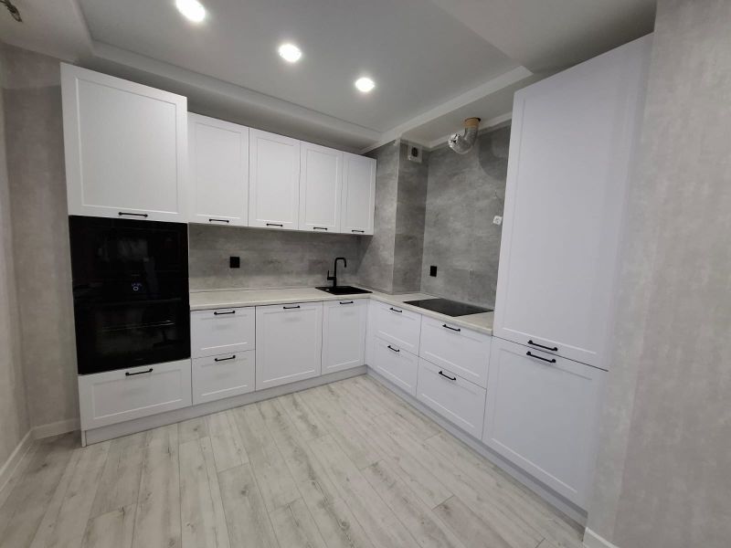 Глянцевая белая кухня угловой планировки, со встроенной техникой, с неотразимыми черными ручками. Она сочетает в себе элегантность, современность и комфорт, создавая идеальное пространство для приготовления пищи и общения с близкими.