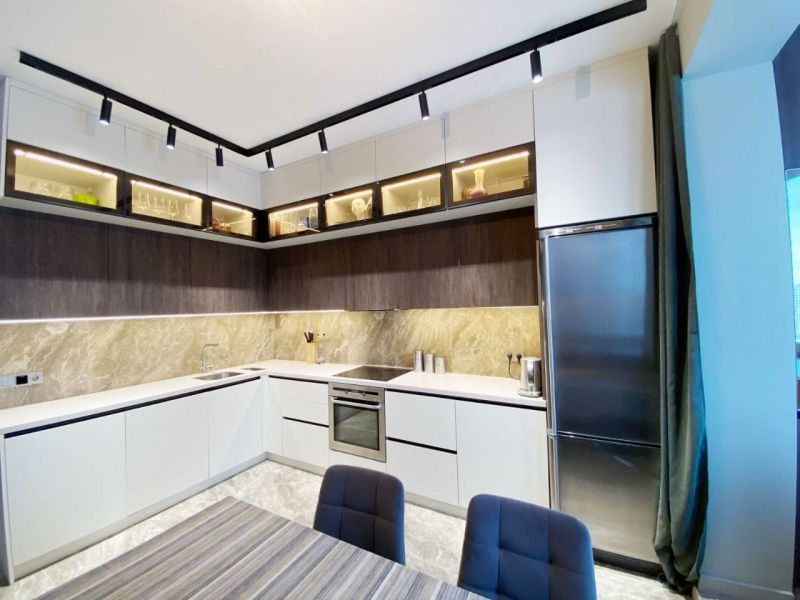 Современная большая кухня угловой планировки древесно-белого цвета, со встроенной техникой и подцветкой рабочих зон, под потолок.