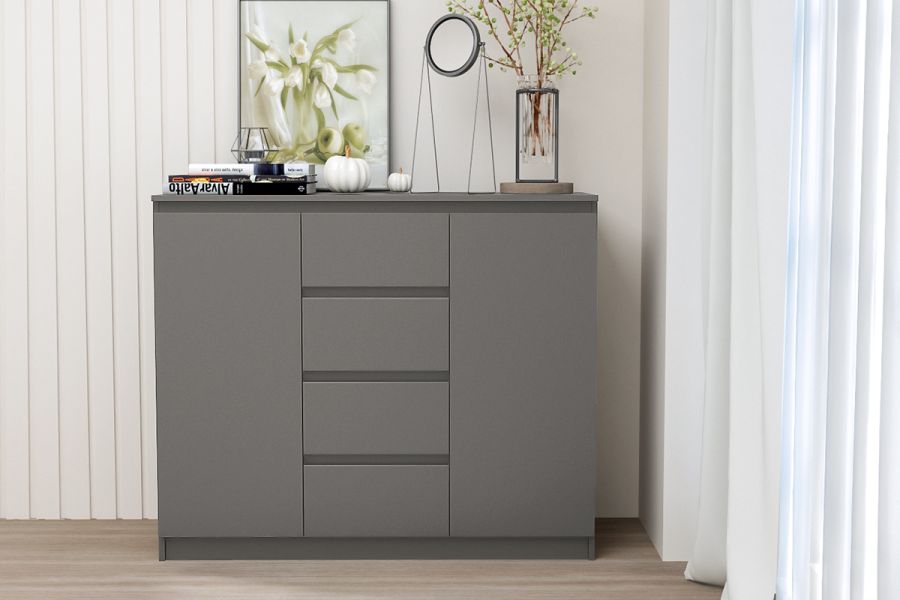 Комод с четырьмя выдвижными ящиками и двумя закрытыми нишами с полками внутри - удобная и полноценная система хранения, идеально подходящая для любого помещения: спальни, гостиной, рабочего кабинета, детской.