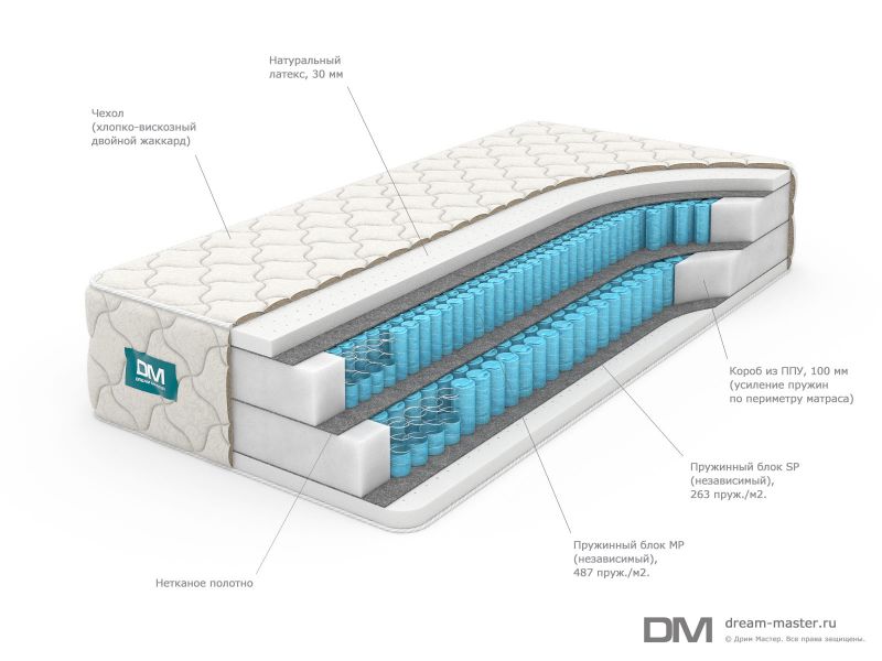 Мягкий и комфортный ортопедический матрас с наполнителем из натурального бельгийского латекса высотой 3 см, расположенным по обеим сторонам от пружинных блоков. Данный матрас схож по степени мягкости с моделью Дрим Дуэт 4 SP-MP, но отличается большей долговечностью, вследствие использования исключительно натуральных материалов.