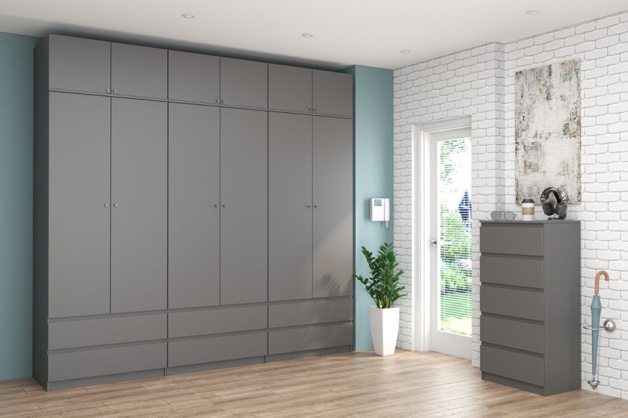 - Три высоких 2 створчатых шкафа. За распашными дверями находятся полки и металлическая штанга для одежды; внизу - два выдвижных ящика (902х2204х574 мм);