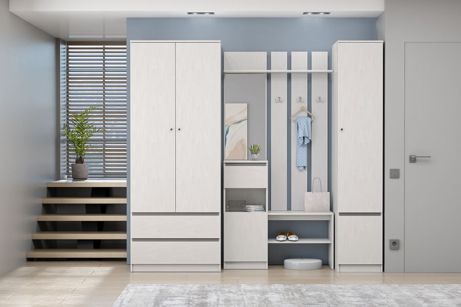 Прихожая в светлых оттенках "Кэт - 1" создаёт ощущение уюта и комфорта. В ней много света, воздуха и ничего лишнего.